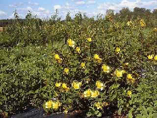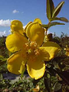 Fleurs jaunes à anthères orangées très nombreuses, fructification rose.